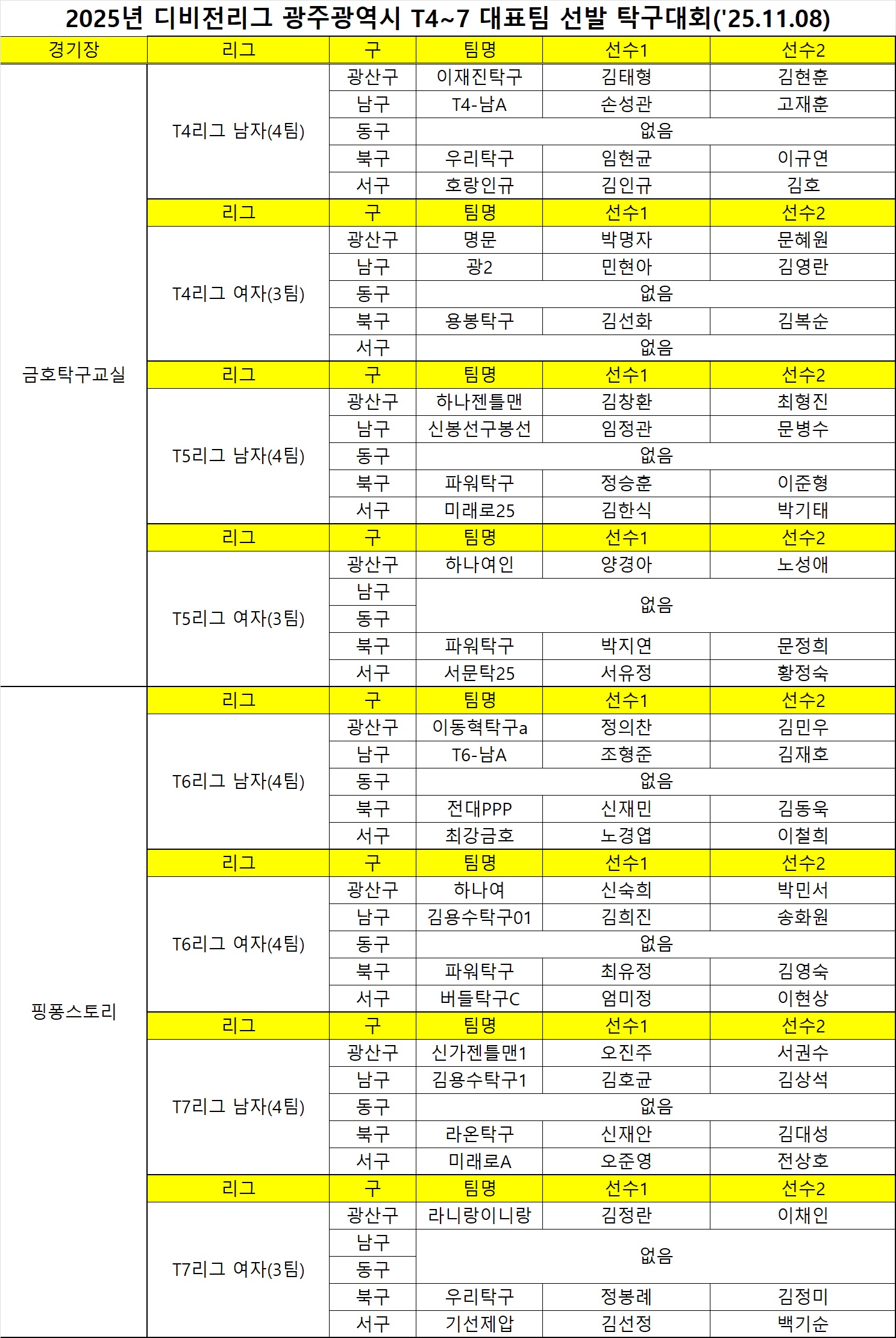 2025년 광주광역시 T4~7 디비전리그 탁구대회 대진표