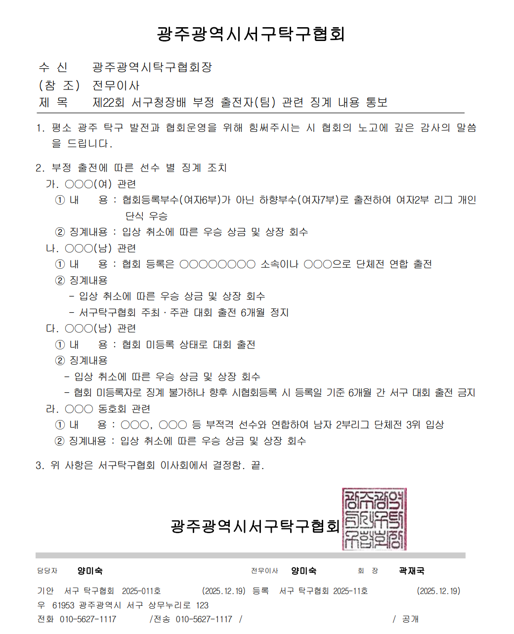 제22회 서구청장배 부정출전자 관련 징계내용 공지
