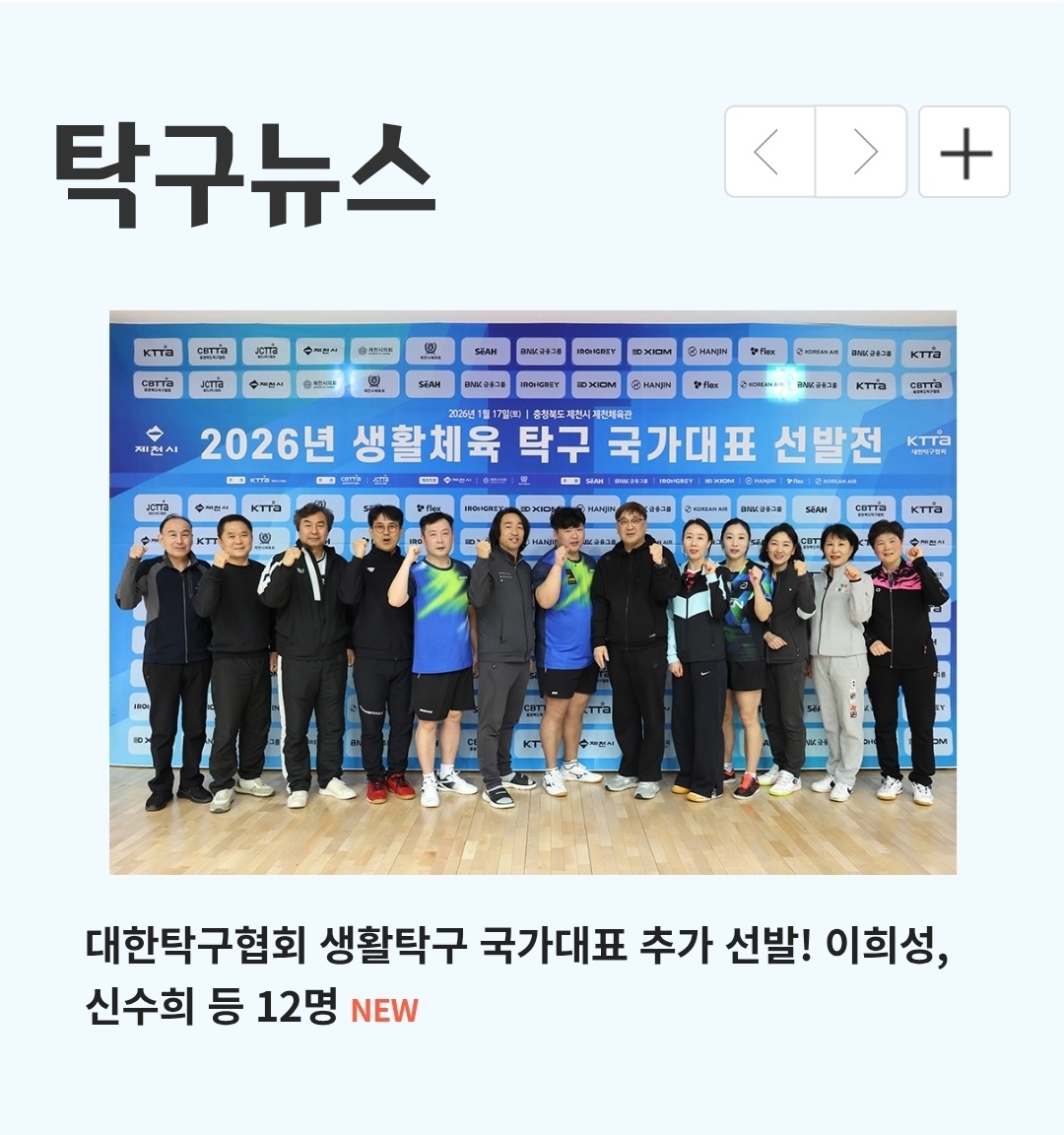 대한탁구협회는 지난 17일 충북 제천체육관에서 선발전을 열고 2026년 생활체육 탁구 국가대표를 추가 선발했다고 밝혔다.