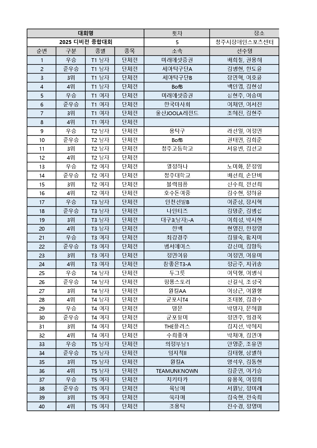 2025 디비전리그 종합대회 T1~T7 결과